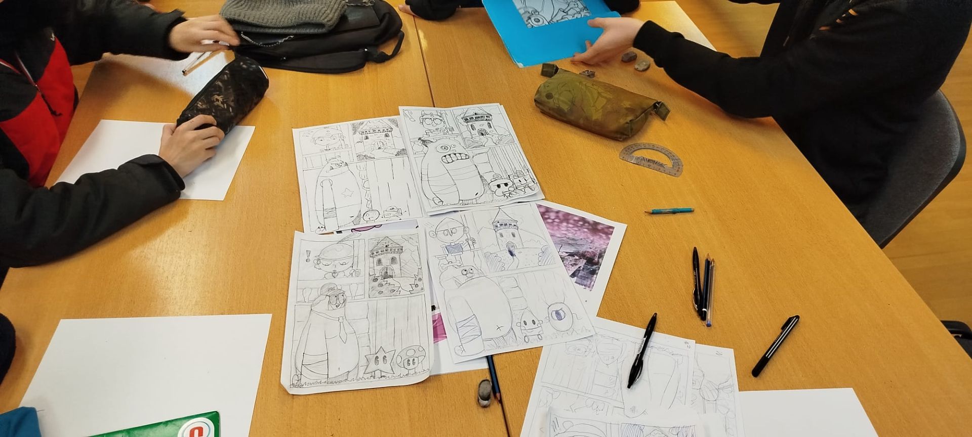 Atelier création d’une page BD à partir de différents modèles. Une première planche au stylo bille qui mêle découpage d’une planche et création de personnage...à suivre