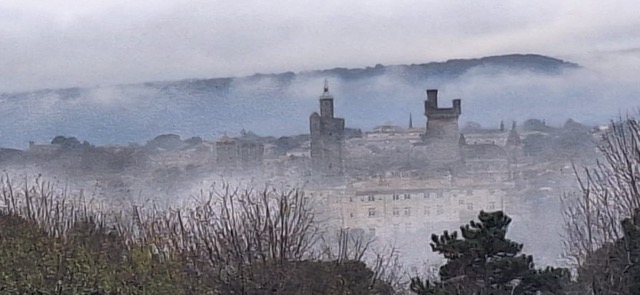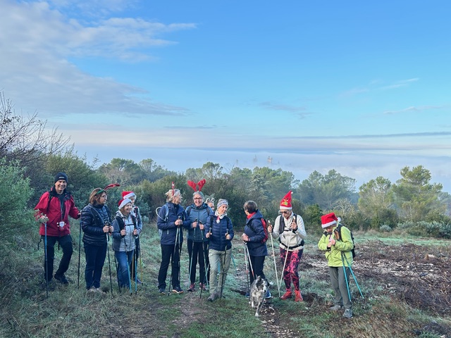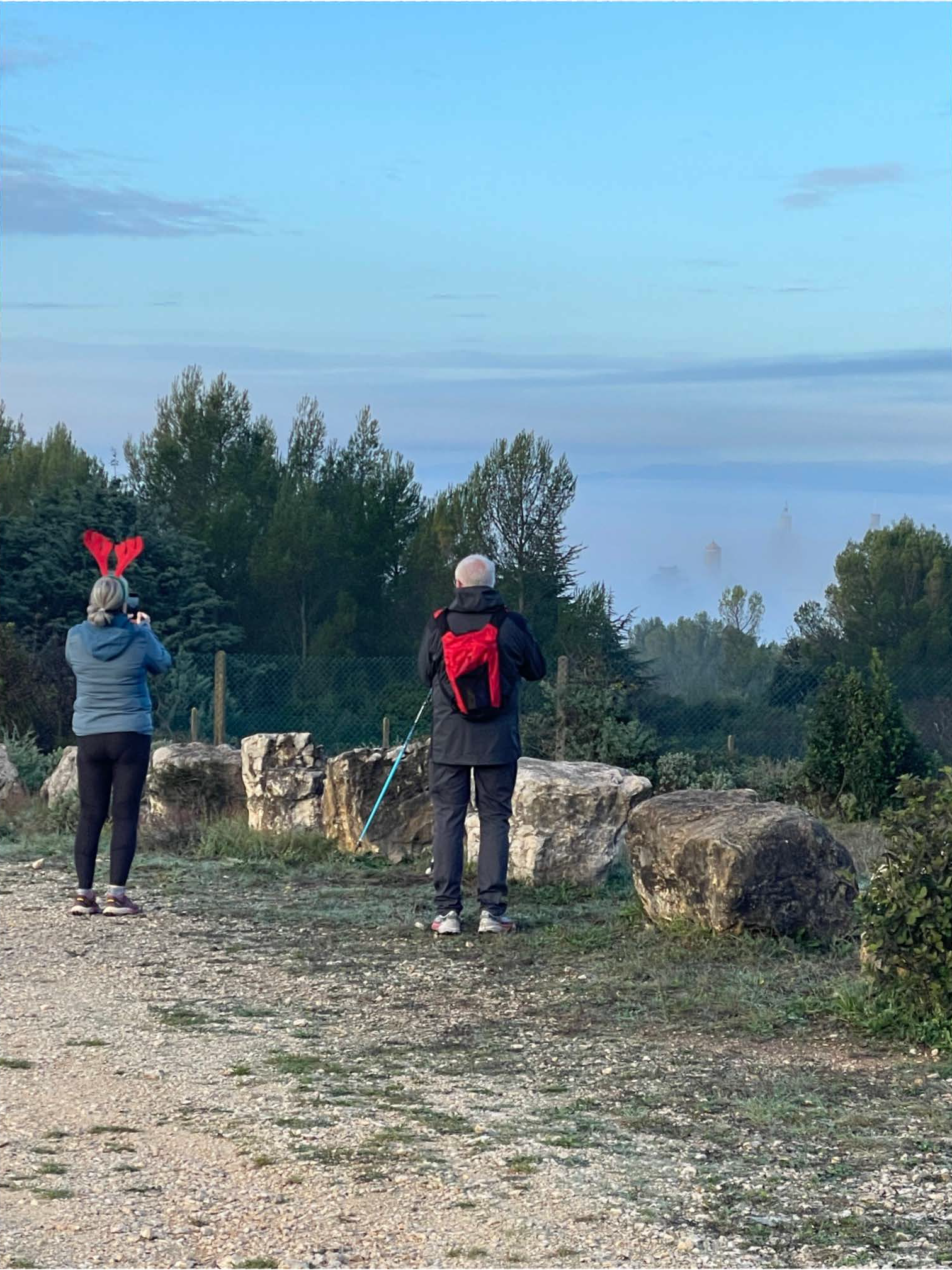 Pour la dernière marche nordique – cool - de l’année, les marcheurs ont profité d’un paysage exceptionnel. Depuis les hauteurs de Saint Siffret les tours d’Uzès ont soudainement émergé de la brune matinale qui enveloppait la vallée. Difficile de quitter des yeux cet instant magique et de mettre un pied devant l’autre sans ralentir le rythme.