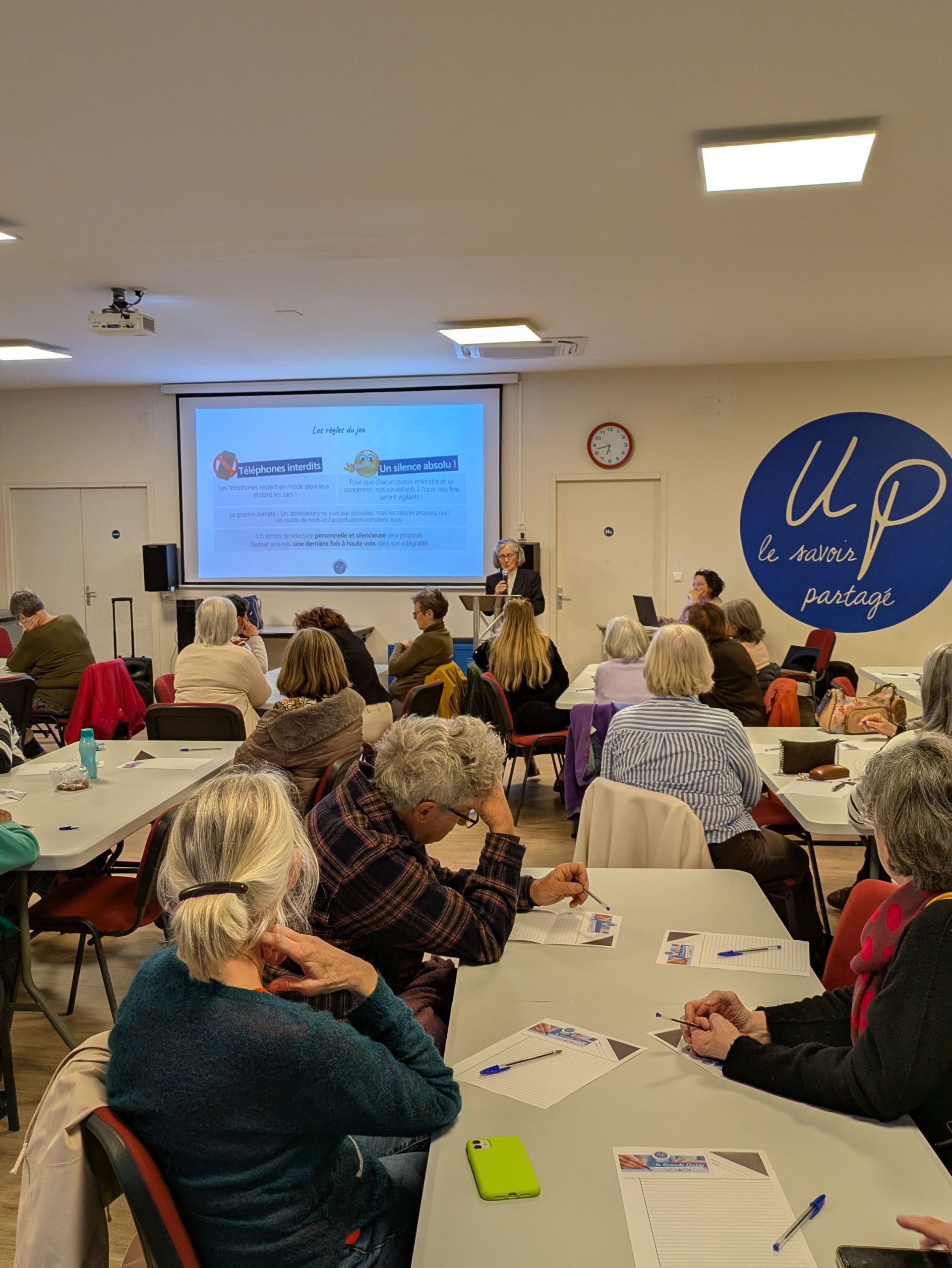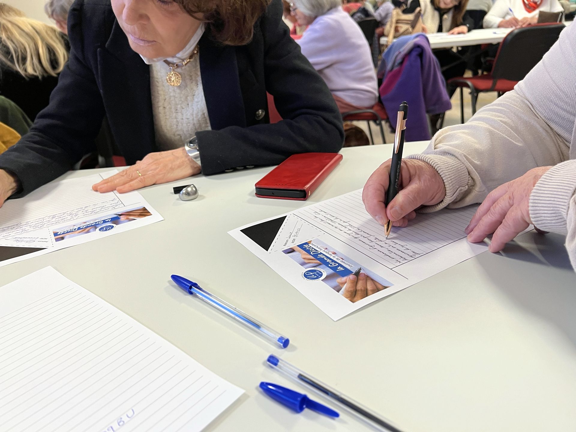 Tous le monde a ensuite saisi la plume pour la "grande" dictée. Le texte de cette année a été choisi pour sa fidélité à l’esprit des Universités Populaires, un fervent plaidoyer pour l’éducation de l’enfant et de tous de Marguerite Yourcenar : Les Yeux ouverts.